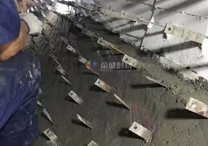 高溫段因需要考慮耐火以及耐磨等因素則采用重質澆注料加輕質澆注料相結合的復合結構,鏈篦機爐頂和高溫段側墻一般采用錨固磚結合澆注料的形式,但在高溫段側墻水平方向上需鋪設一條托板,這樣做的好處是人為設置一條膨脹縫,可以較大程度地消除因為膨脹對錨固磚產生的破壞作用。